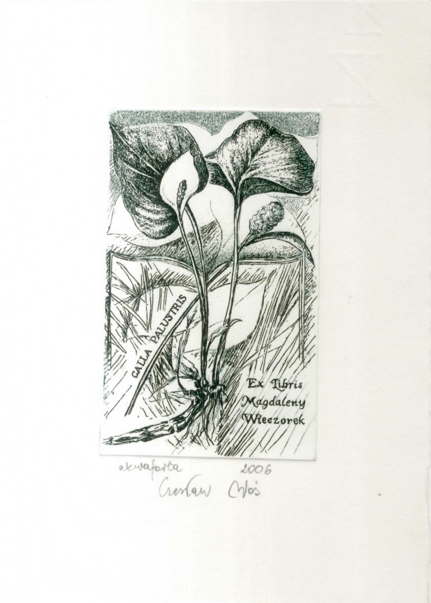 Przedstawia roślinę o nazwie czermień błotna (łac. Calla palustris).