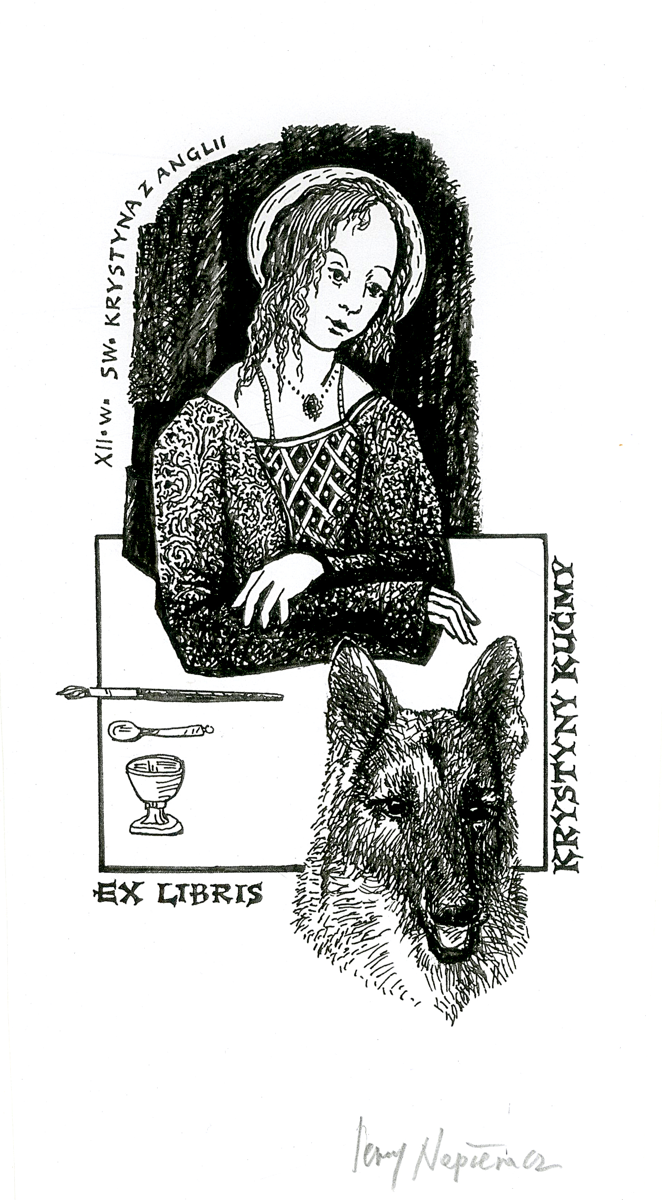 Św. Krystyna z Anglii; wilk; kielich; łyżka; pióro
