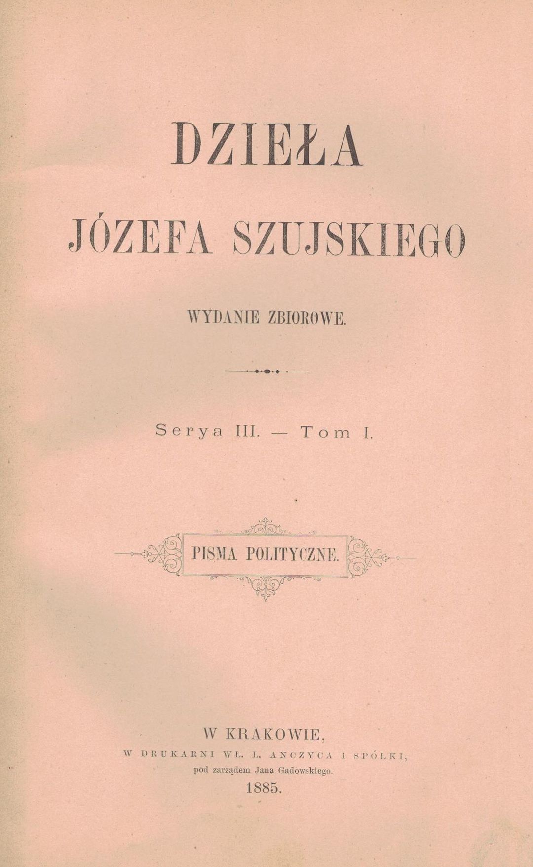 Pisma polityczne / Józef Szujski. - Kraków : Nakł. rodziny J. Szujskiego, 1885. - [8], 415 s. ; 26 cm.