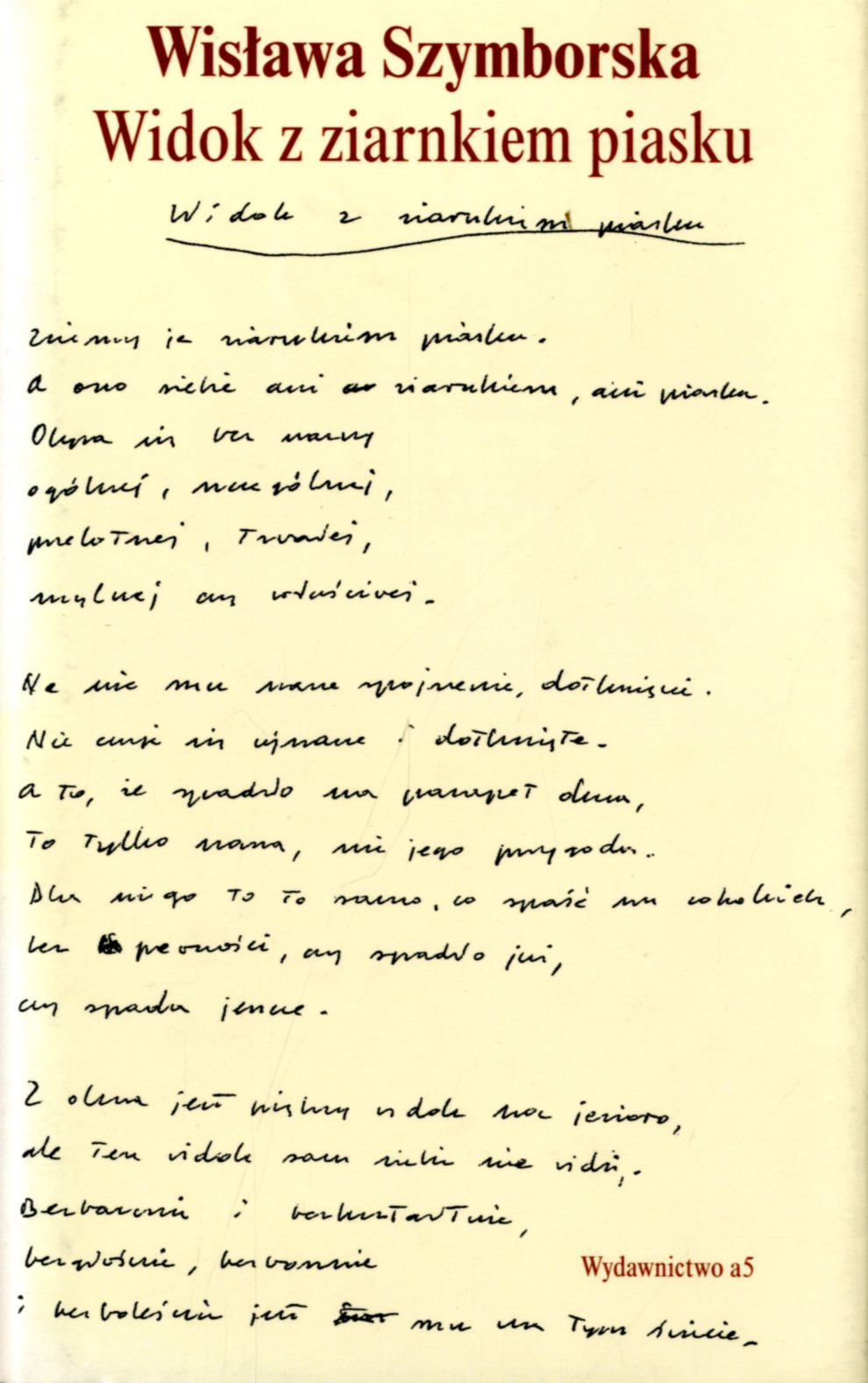 Widok z ziarnkiem piasku : 102 wiersze / Wisława Szymborska. - Wydanie pierwsze. - Poznań : Wydawnictwo "a5", 1996 (Białyst. : BZG). - 186, [5] stron ; 21 cm.